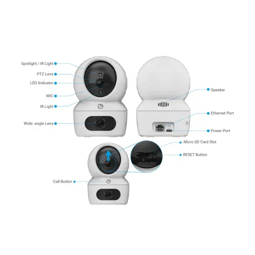 The EZVIZ H7c 4MP Dual Lens 2K Pan & Tilt Portable WiFi Camera comes with two 2K+ resolution lenses. provides a broad perspective, guaranteeing that no detail is overlooked. While the PT lens offers fine pan and tilt adjustment and covers a 60° diagonal view for concentrated monitoring, the fixed lens offers a 108° diagonal view. The EZVIZ H7c 4MP Dual Lens WiFi Camera’s clever color night vision improves security 24/7 by producing sharp, colorful video even in low light. By minimizing false alarms and concentrating on real threats, the AI-powered human shape detection and loud noise detection functions guarantee accurate notifications. The co-detection feature of the EZVIZ H7c 4MP Dual Lens Portable WiFi Camera allows for automatic smart tracking, and the one-tap control makes it possible to switch between lenses with ease. Sleep mode protects privacy when necessary, and two patrol modes offer automated security coverage. Dual-band Wi-Fi 6 (2.4GHz and 5GHz) is supported by the EZVIZ H7c 4MP Dual Lens 2K Pan & Tilt Portable WiFi Camera, guaranteeing dependable and quick connectivity. For compatibility with smart homes, it easily interacts with Amazon Alexa and Google Assistant. A microSD card (up to 512GB) and EZVIZ CloudPlay are storage alternatives for versatile recording options. The WiFi camera optimizes storage and bandwidth utilization without sacrificing quality by using H.265 video compression technology. In a variety of lighting situations, the EZVIZ H7c Dual Lens WiFi Camera produces crisp, noise-free, and balanced images thanks to its 1/3″ progressive scan CMOS sensor, 3D DNR, and digital WDR. For wired connectivity, the camera also has a 10M/100M self-adaptive Ethernet port and a Type-C power interface. With WPA-PSK, WPA2-PSK, and WPA3-Personal encryption methods, security is improved.